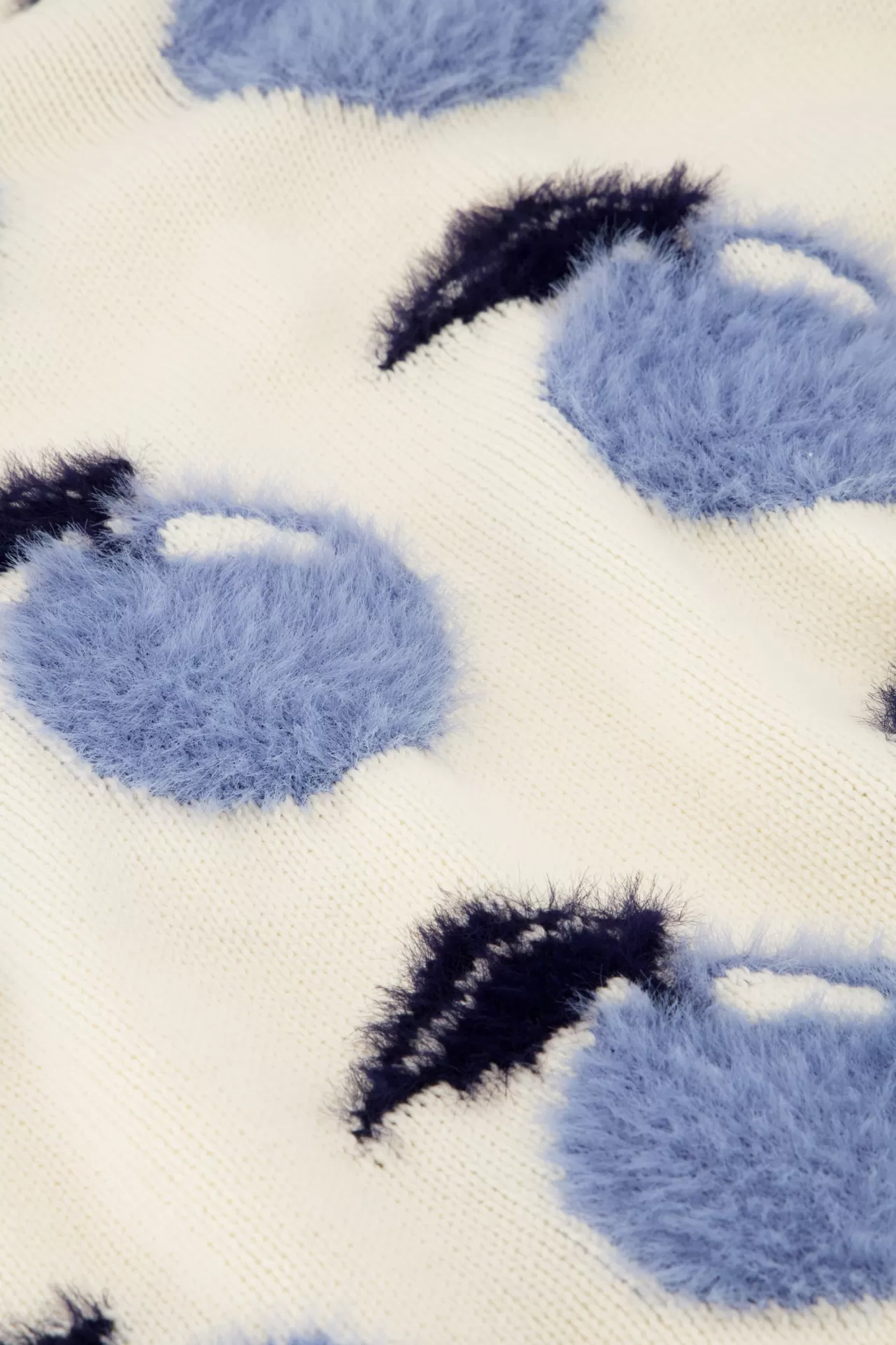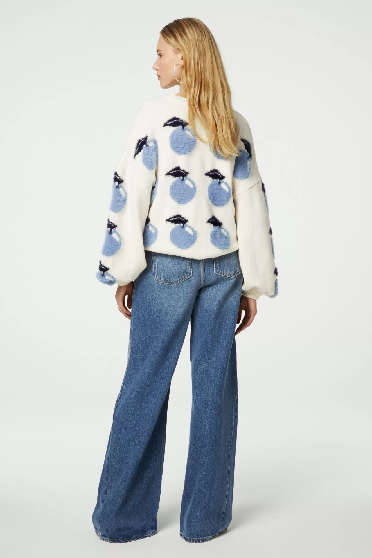 Deze crèmekleurige dames trui voegt een speelse touch toe aan je outfit. De trui heeft een ronde hals, lange mouwen, een blauwe appeltjesprint over de gehele trui en is gemaakt van 60% biologisch katoen en 40% acryl. Maak je look compleet door hem te combineren met onze Bonnie Wide Leg Jeans.