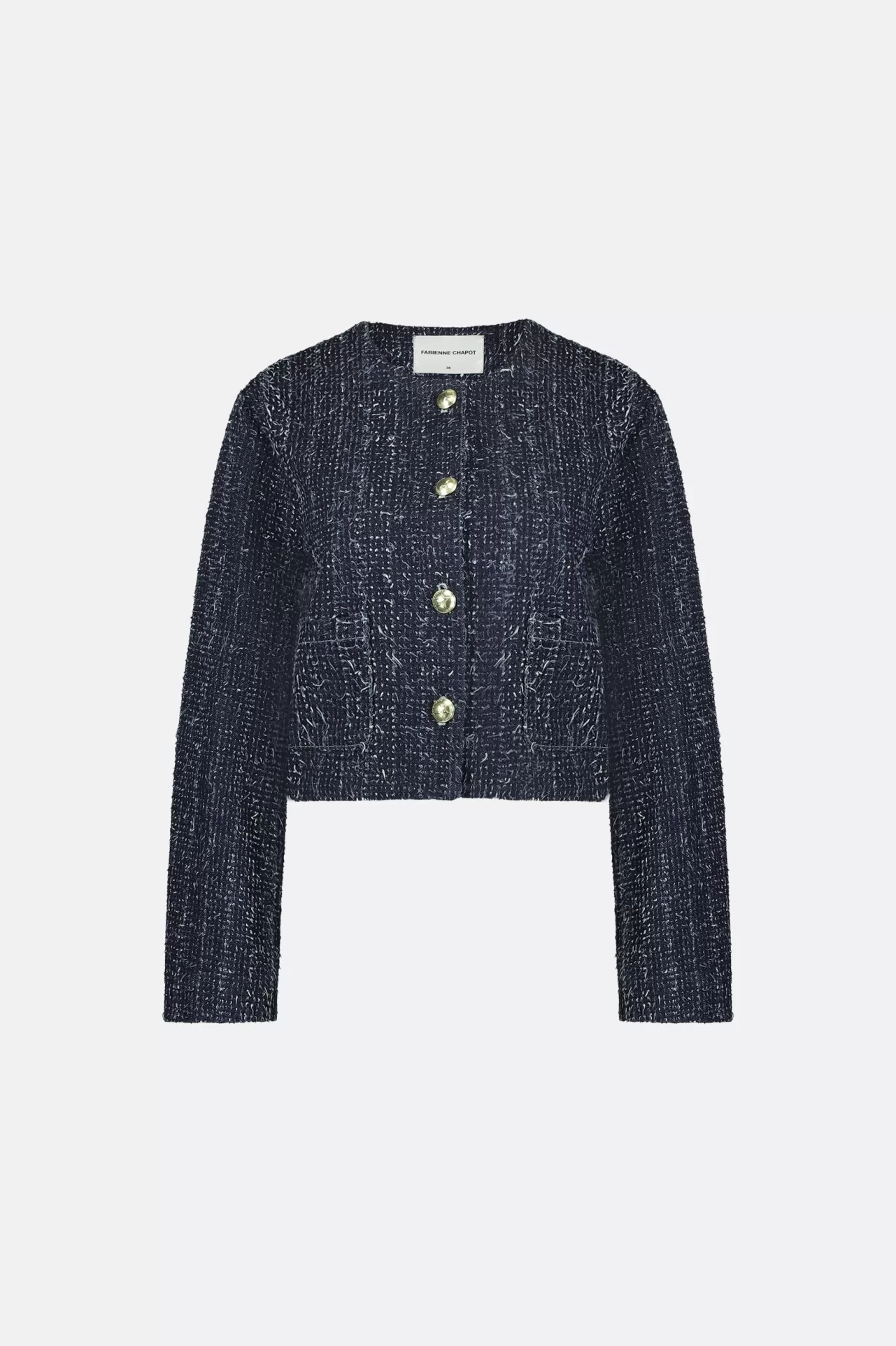 Deze donkerblauwe damesblazer heeft een tweed-geïnspireerde look, een ronde hals en goudkleurige knopen. Geschikt voor zowel casual als chique gelegenheden. De Davis Blazer is perfect om te dragen over je favoriete top, combineer hem met de Thea Wide Leg Tweed Jeans voor de perfecte look.
