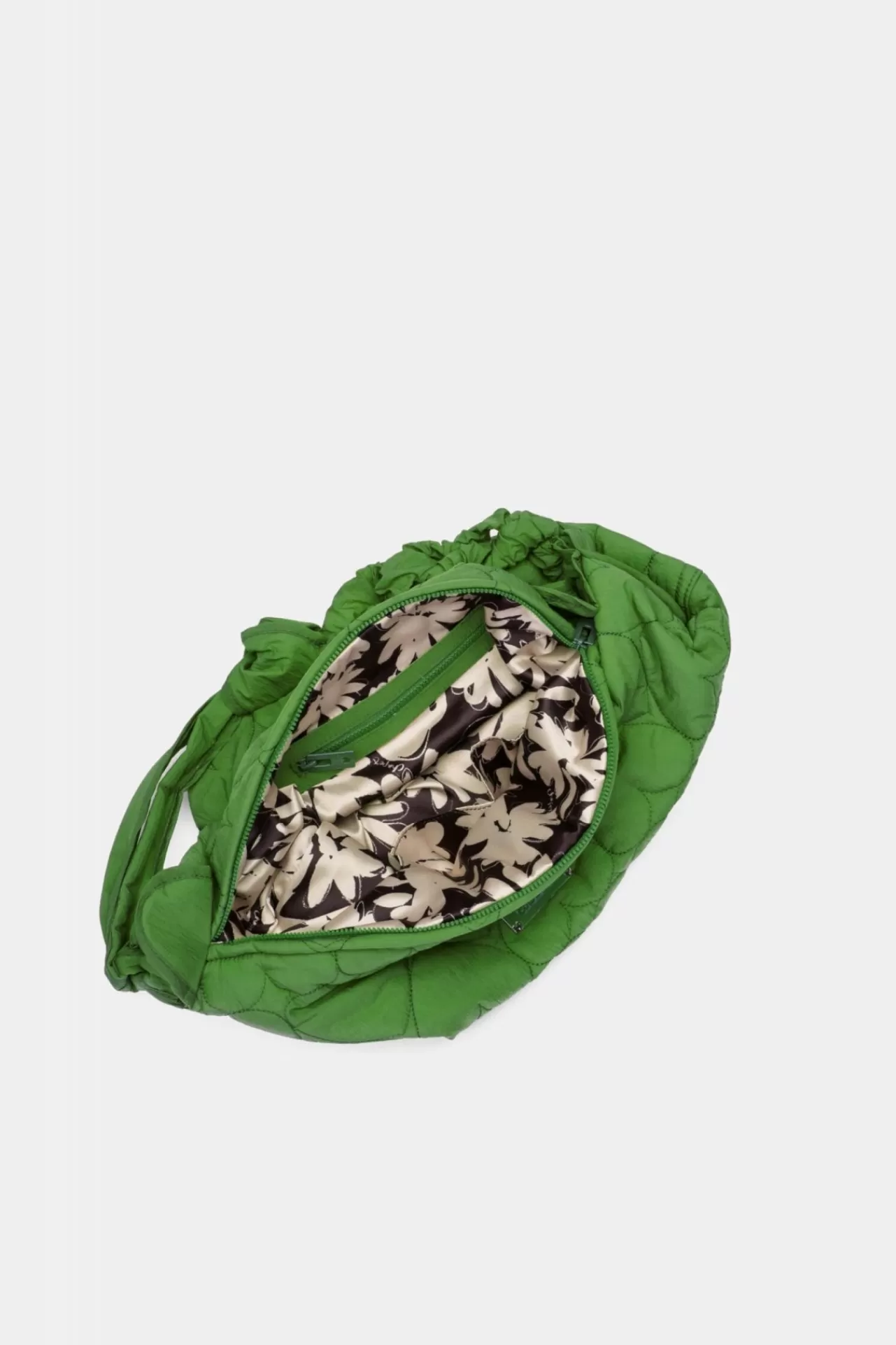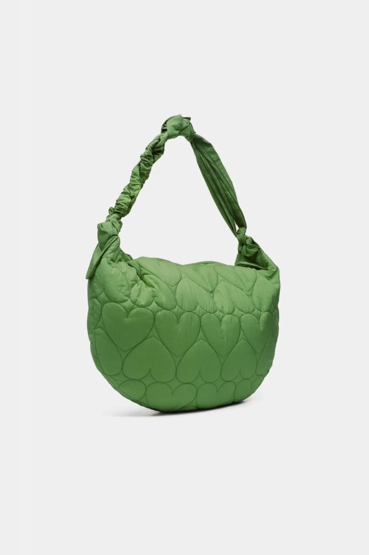 Deze middelgrote, groene tas met hart-quilt heeft een kort, rekbaar handvat en het Fabienne Chapot-merklabel aan de voorkant. Gemaakt van 100% nylon, is het de perfecte tas voor dagelijks gebruik.