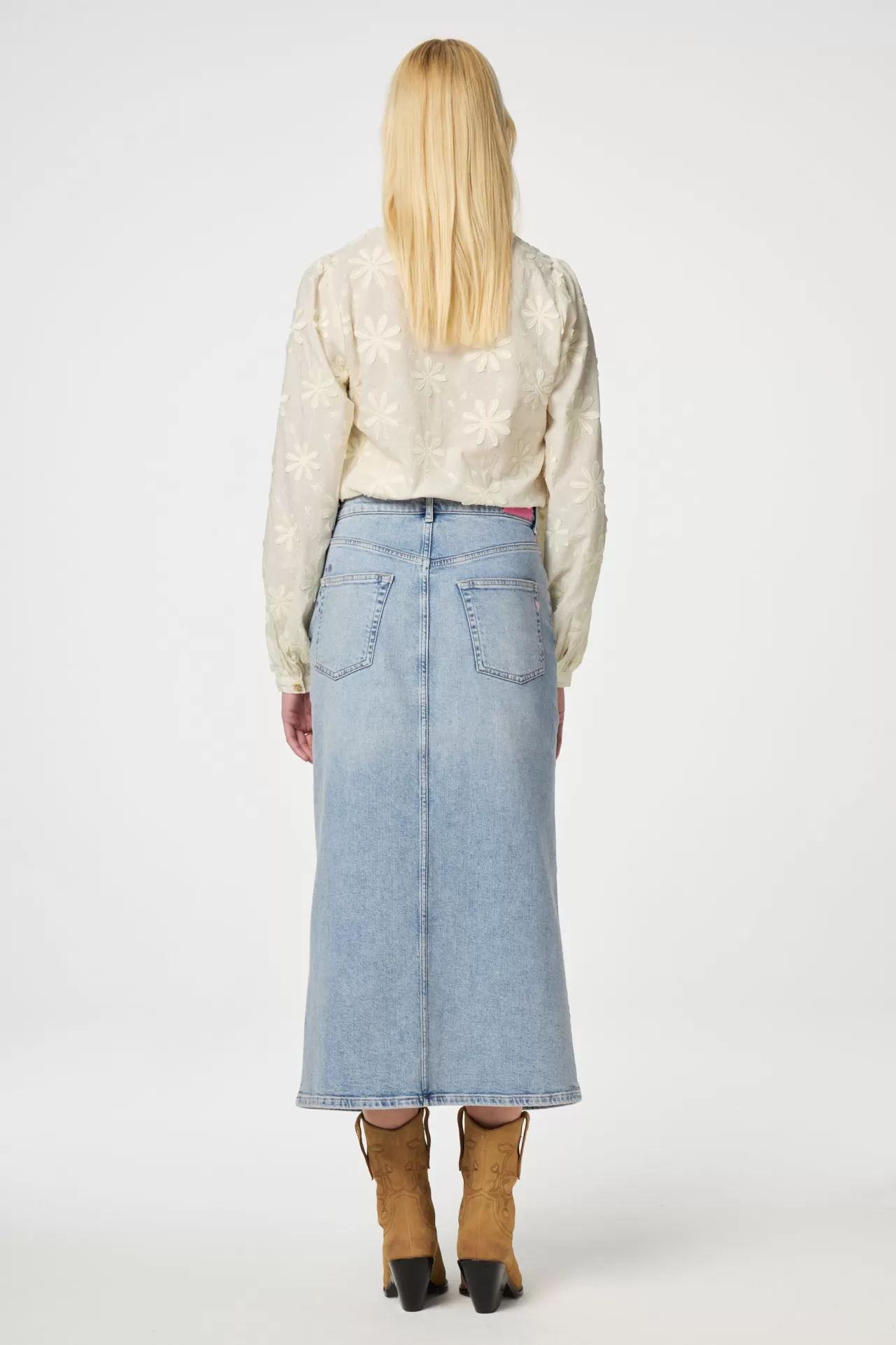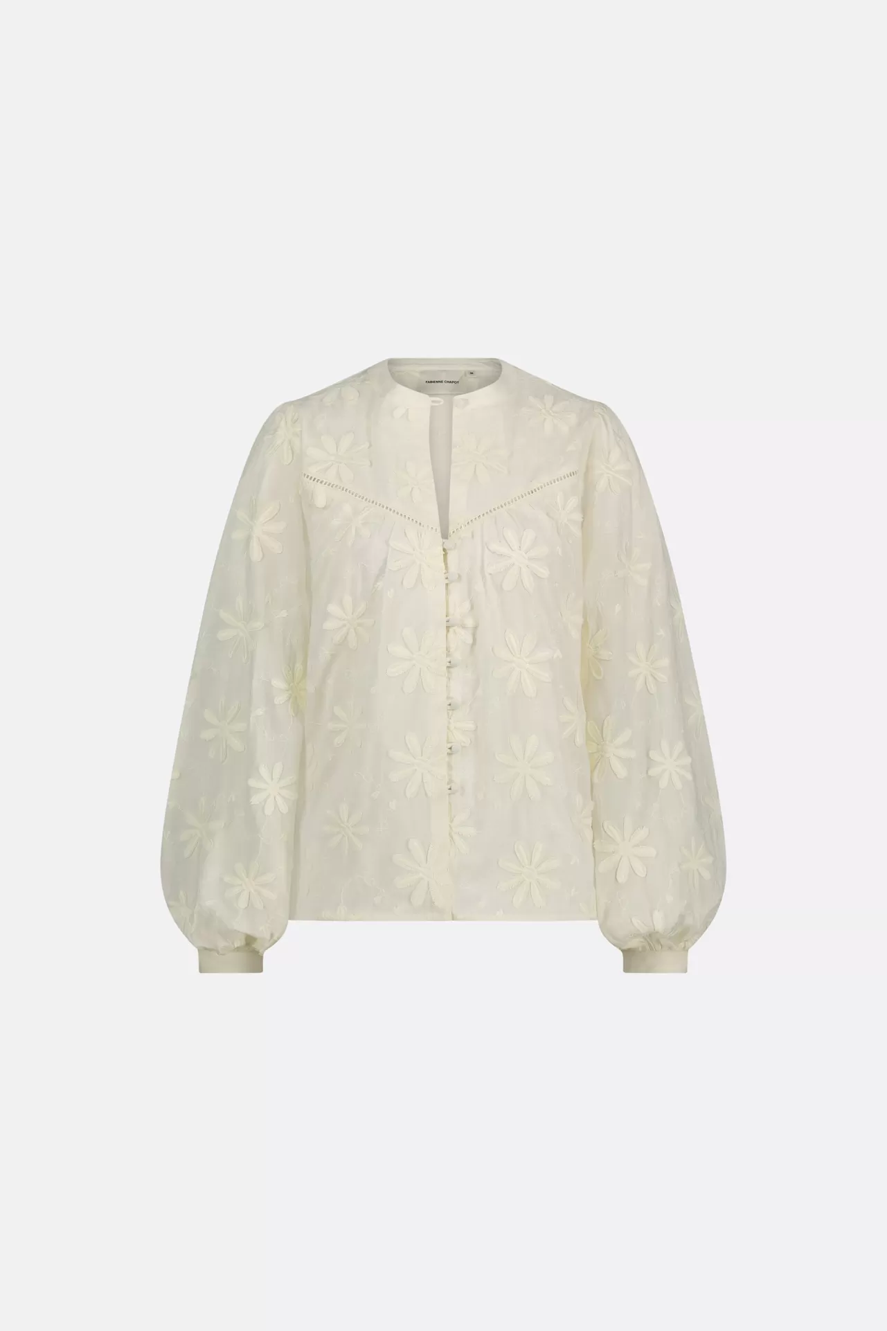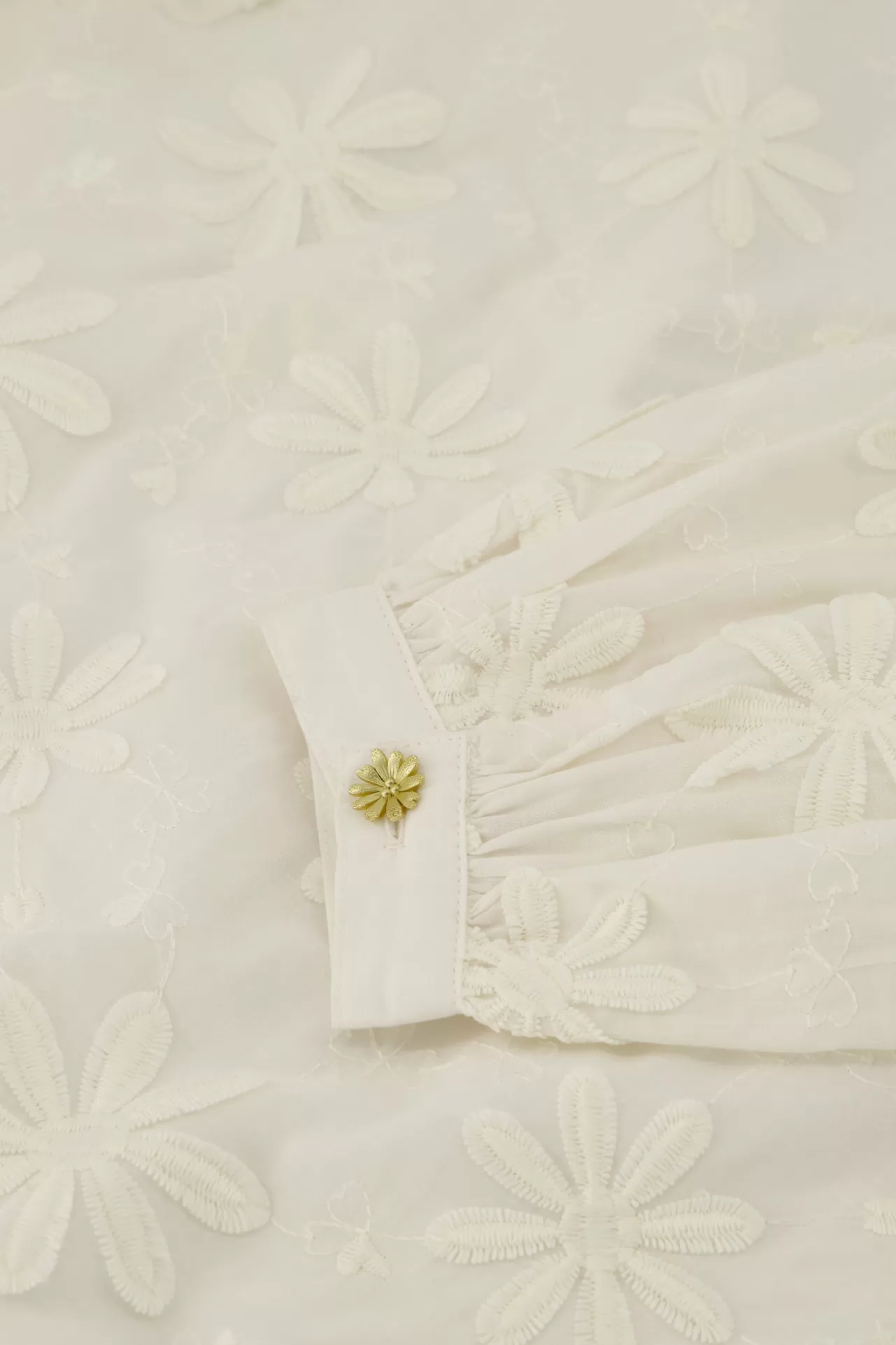 Deze witte dames blouse, met allover borduurwerk, is perfect voor elke gelegenheid. Dit elegante item heeft stoffen bedekte knopen, en charmante pofmouwen, gemaakt van 100% katoen. Combineer de Fiore Blouse met onze Carlyne Skirt voor een casual vrouwelijike look.