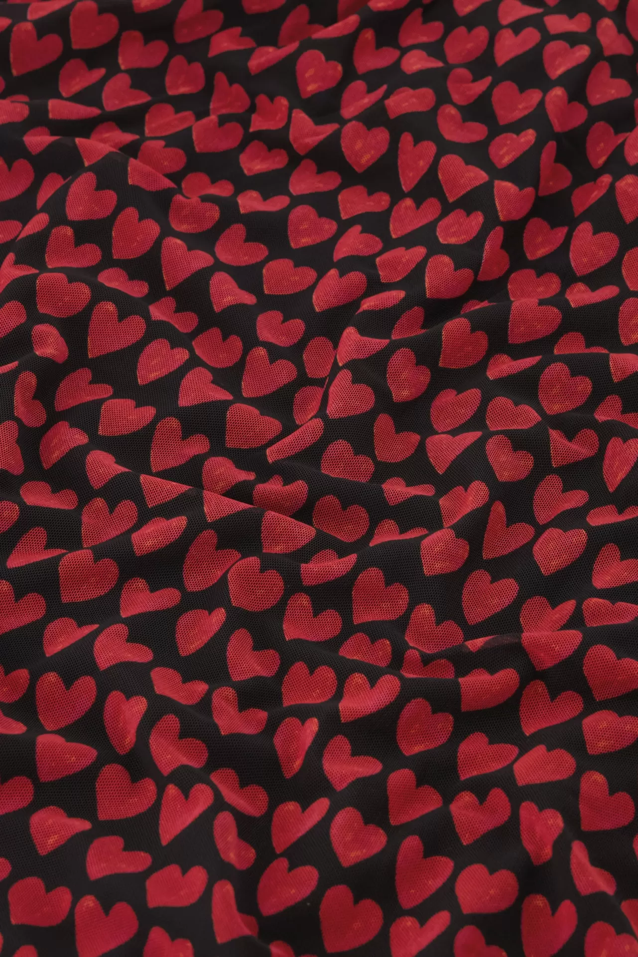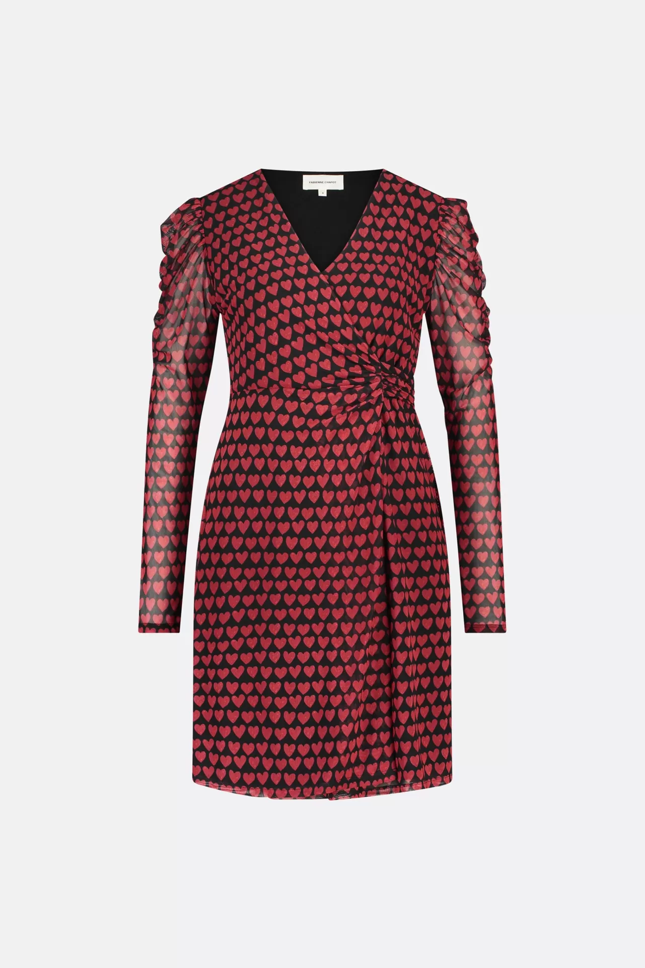 Deze zwarte dames wikkeljurk heeft een V-hals, lange mouwen en een korte lengte. De jurk heeft een rode hartjesprint en is gemaakt van 100% polyester. Het is een vrouwelijke jurk, perfect voor zowel overdag als ’s avonds.