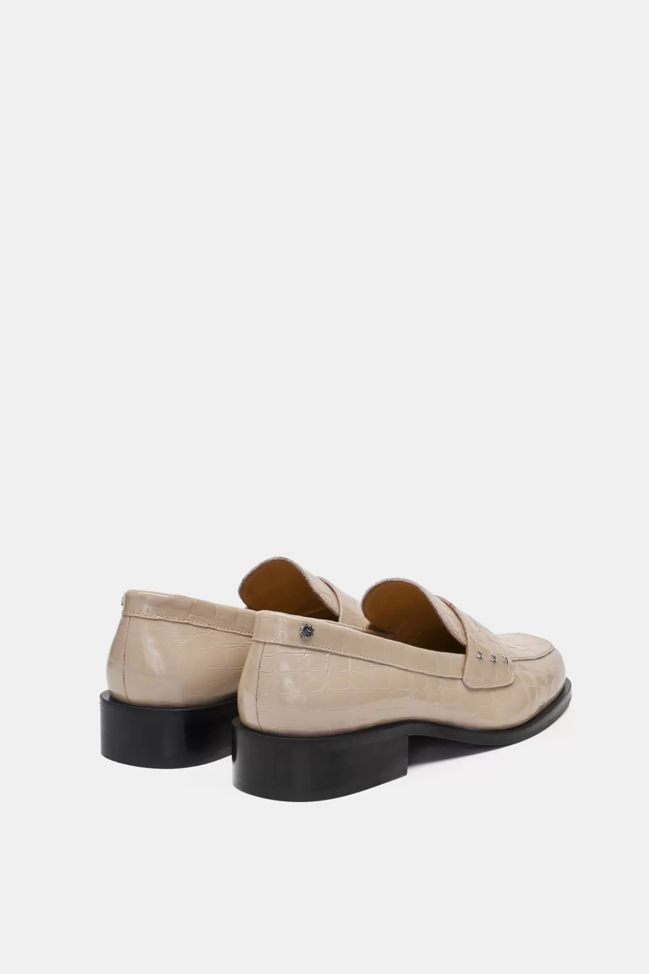 Deze beige loafers met ronde neuzen hebben een lage hak, croco-textuur en vier zilveren studs. Gemaakt van 100% koeienle…