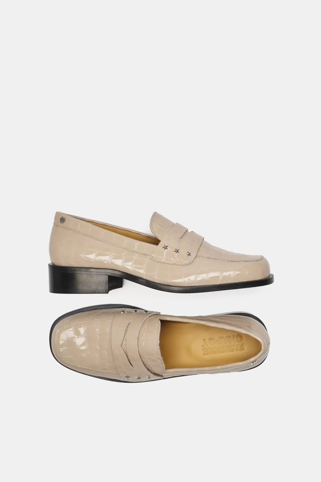 Deze beige loafers met ronde neuzen hebben een lage hak, croco-textuur en vier zilveren studs. Gemaakt van 100% koeienleer, bieden deze loafers een verfijnde maar edgy look.