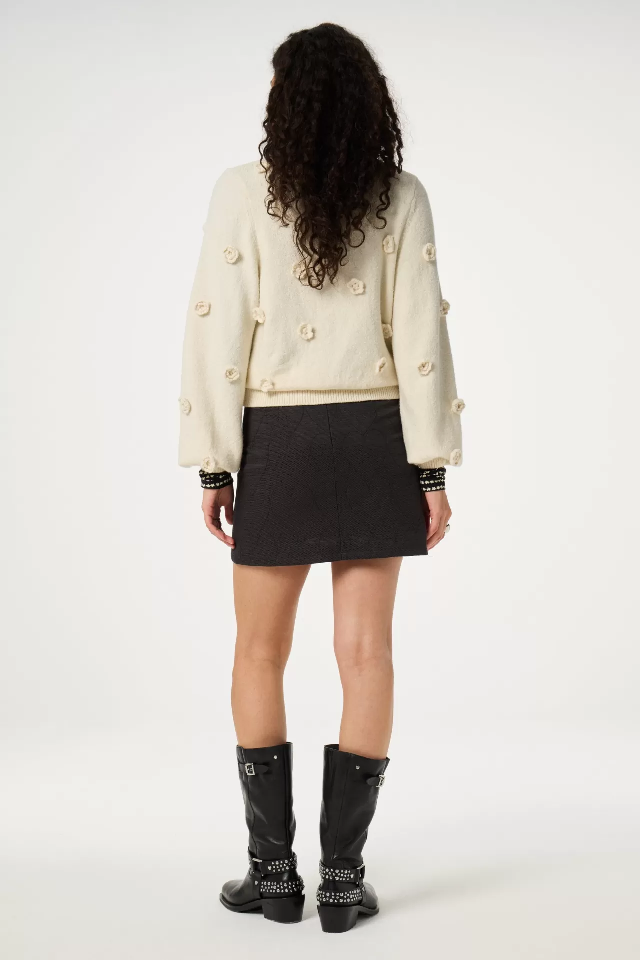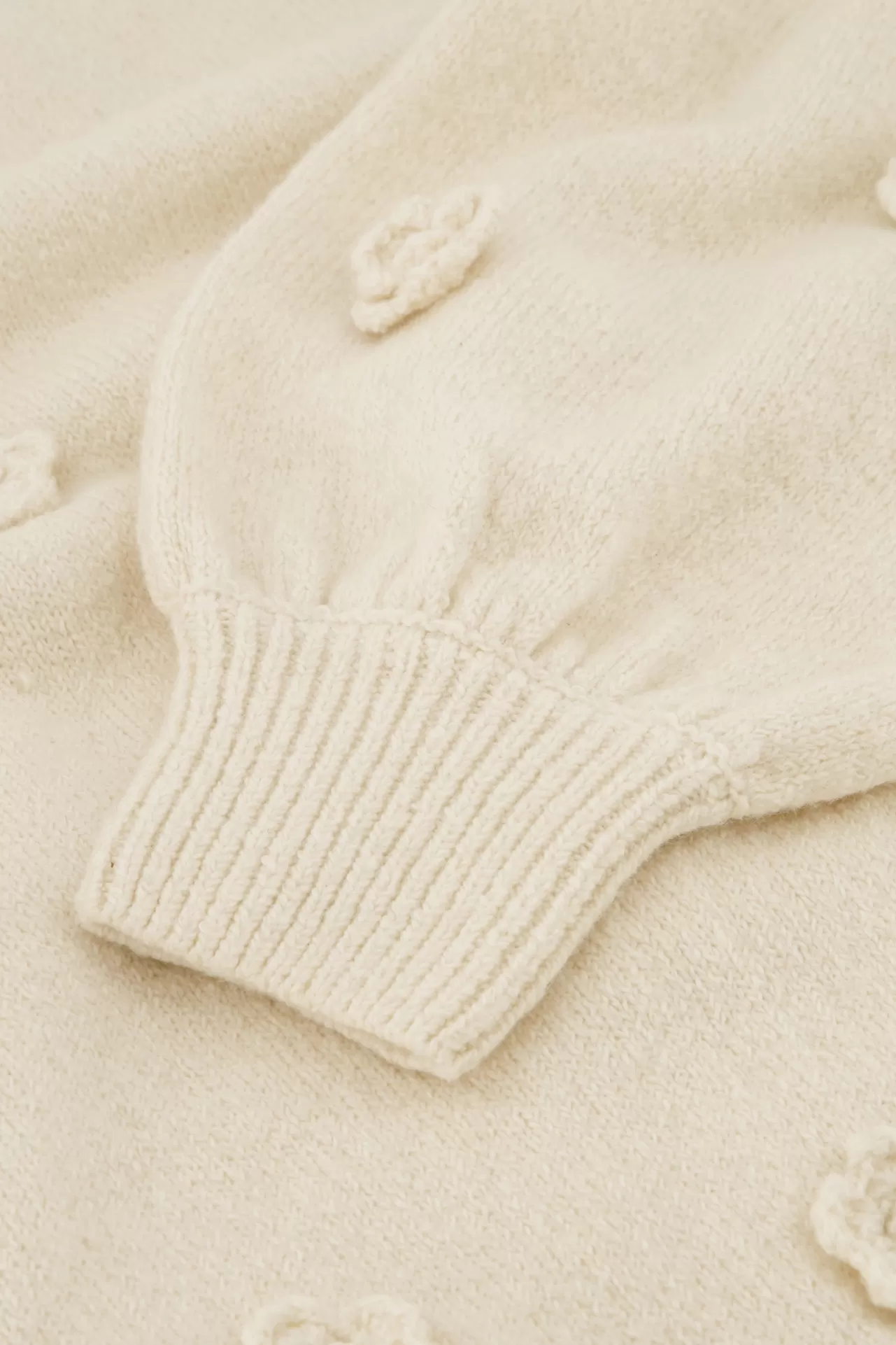 Deze beige dames trui heeft een ronde hals, lange mouwen en gebreide rozen verspreid over de trui. Gemaakt van een mix van 52% katoen, 24% wol, 22% polyester en 2% spandex voor een comfortabele pasvorm. Combineer deze trui met onze Puck Broek voor een casual maar stijlvolle look.