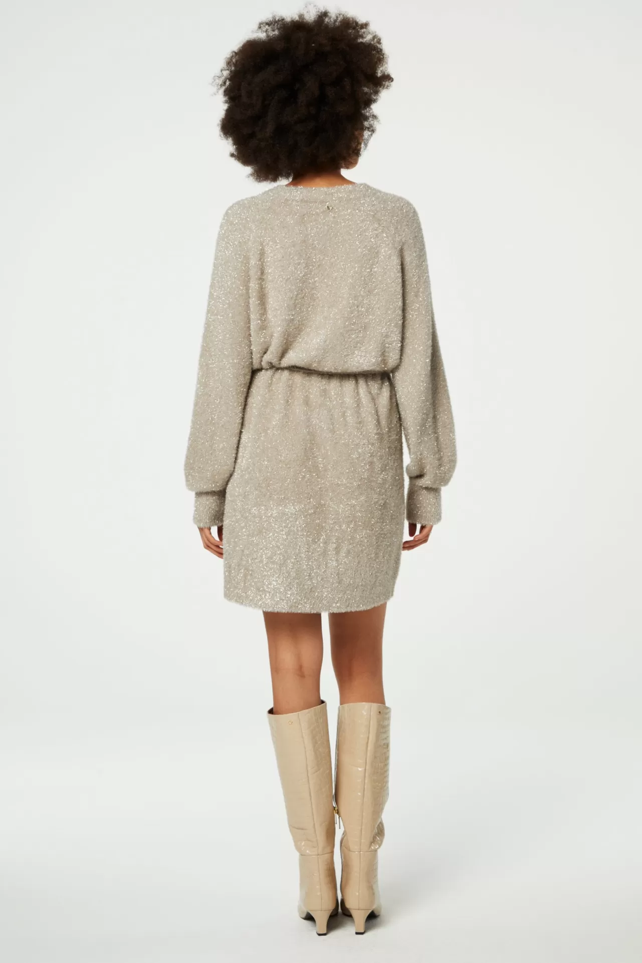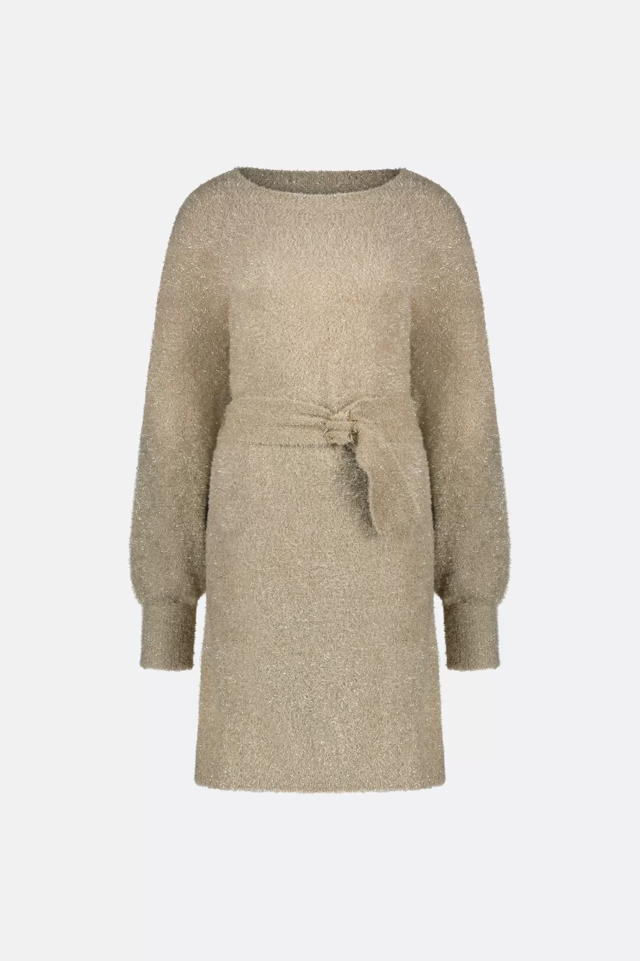 Deze gouden korte glitterjurk voor dames heeft een tailleband en elastische manchetten. Gemaakt van 83% nylon en 17% gemetalliseerde vezel, is het een speels en stijlvol stuk. Combineer het met een paar mooie laarzen voor een chique look.