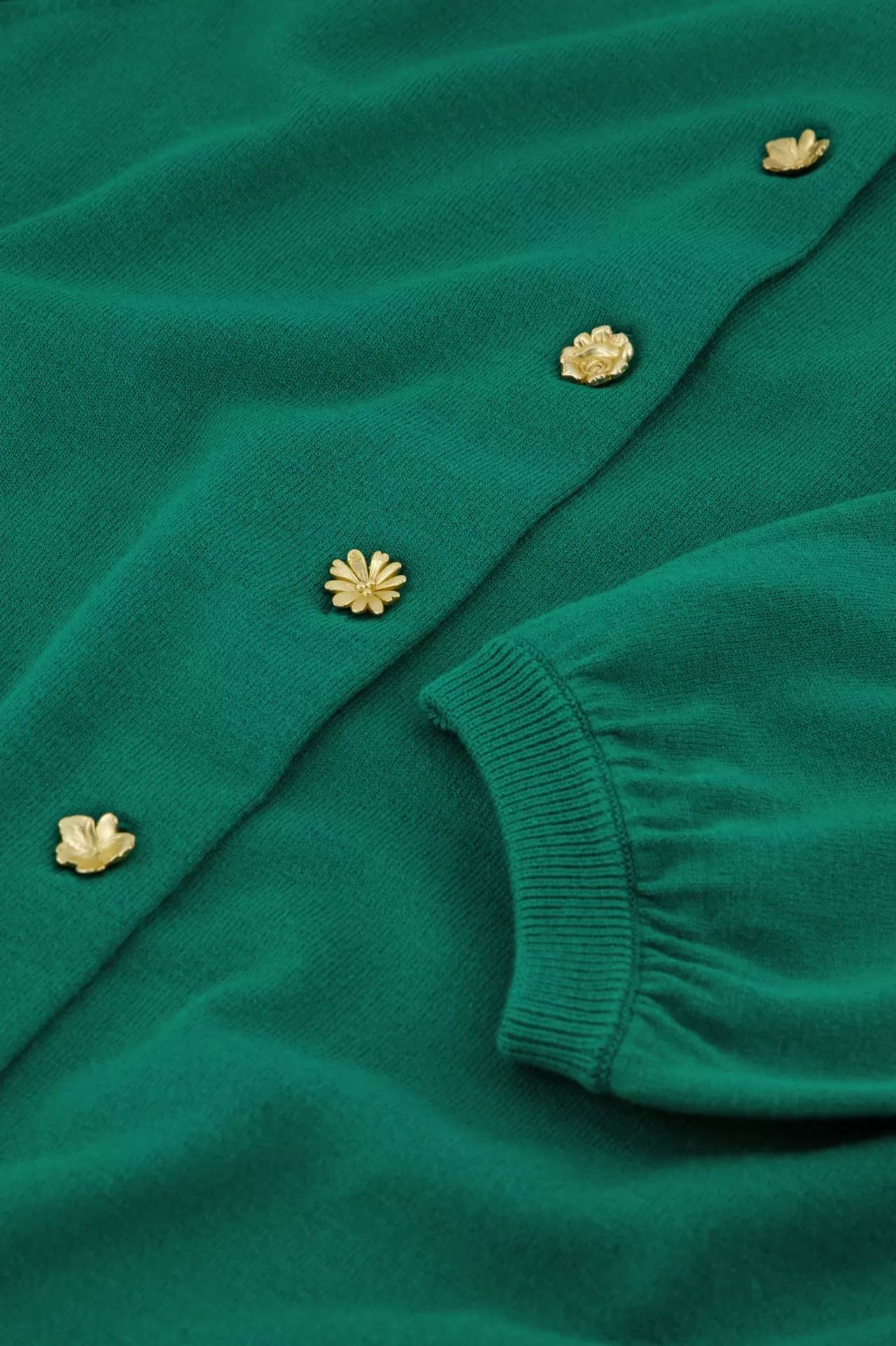 Dit klassiek gebreide dames vest in donkergroen heeft elegante gouden bloemknopen aan de voorkant en lange mouwen. Gemaa…