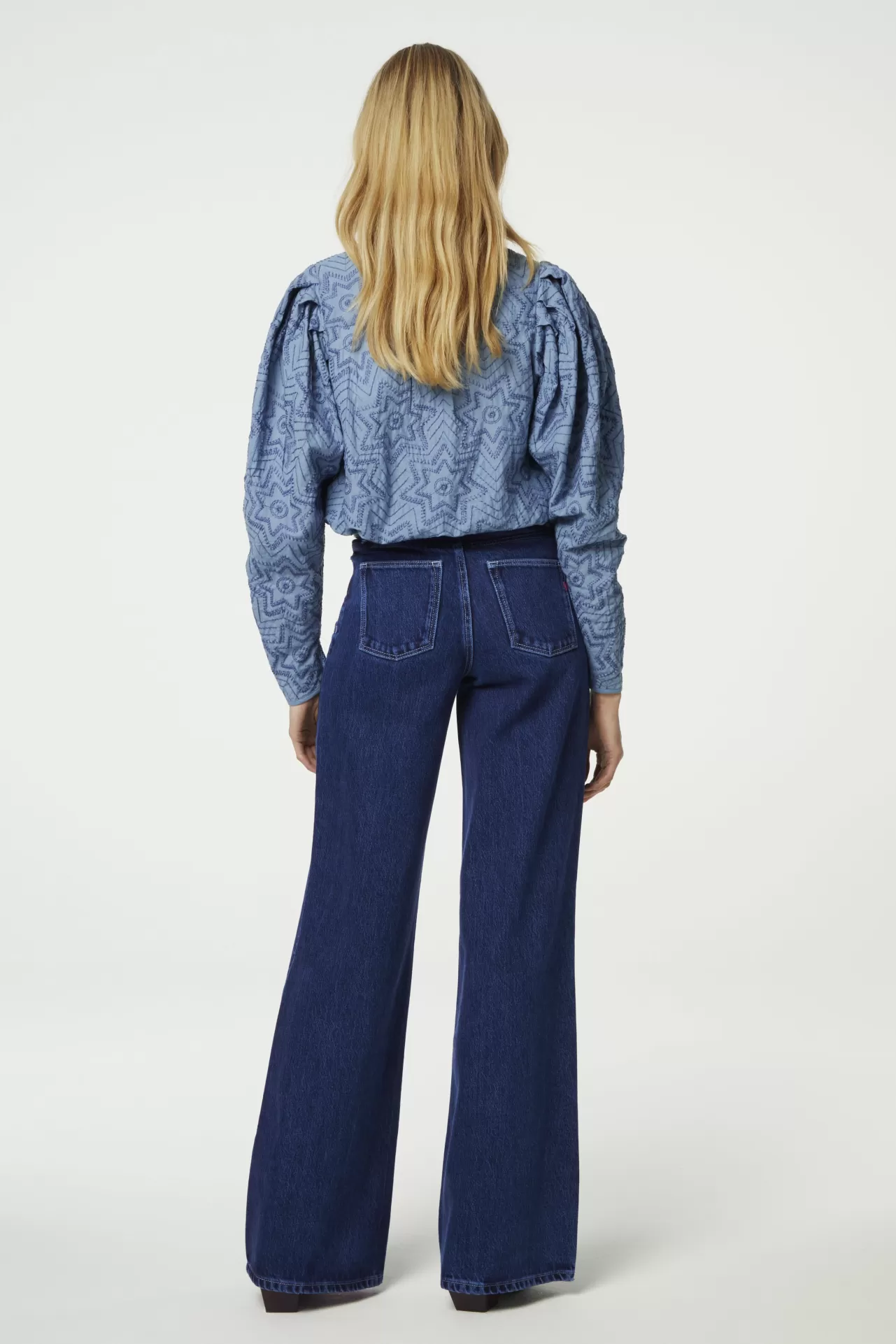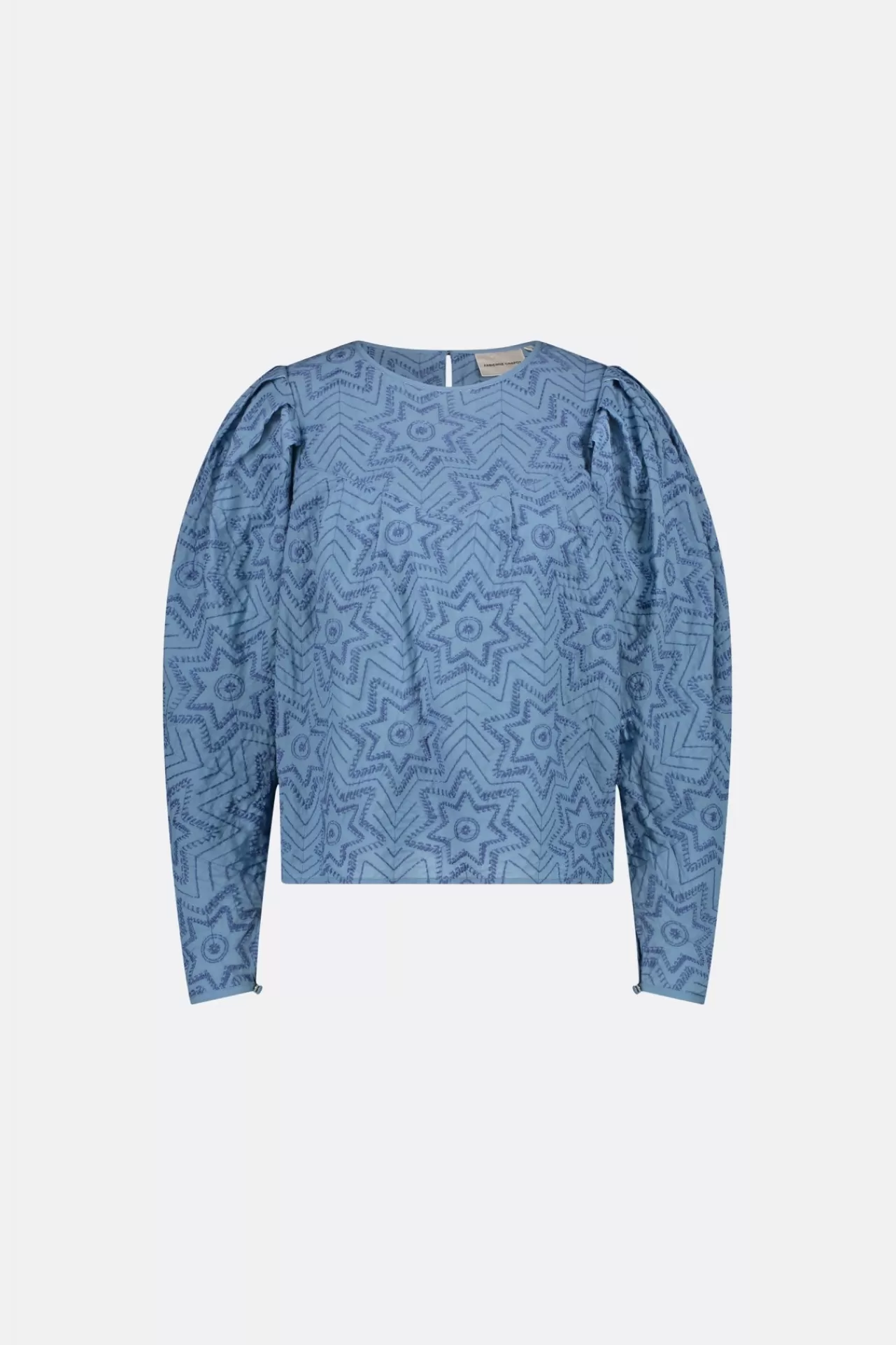 Deze dames top met blauwe print heeft een ronde hals, lange pofmouwen en een wijde pasvorm. Gemaakt van 100% katoen. Combineer deze top met je favoriete jeans voor een relaxte maar toch chique look.