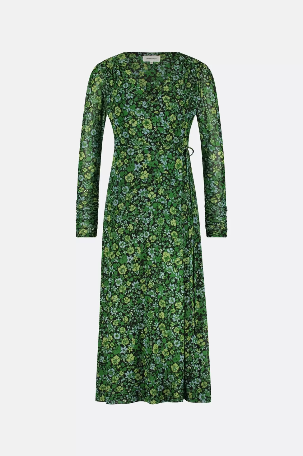 Deze klassieke dameswikkeljurk heeft een V-hals, lange mouwen en een midi-lengte. Dit item bevat een groene bloemenprint, en is gemaakt van gerecycled mesh. Het is een vrouwelijke jurk die perfect is voor elke dag.