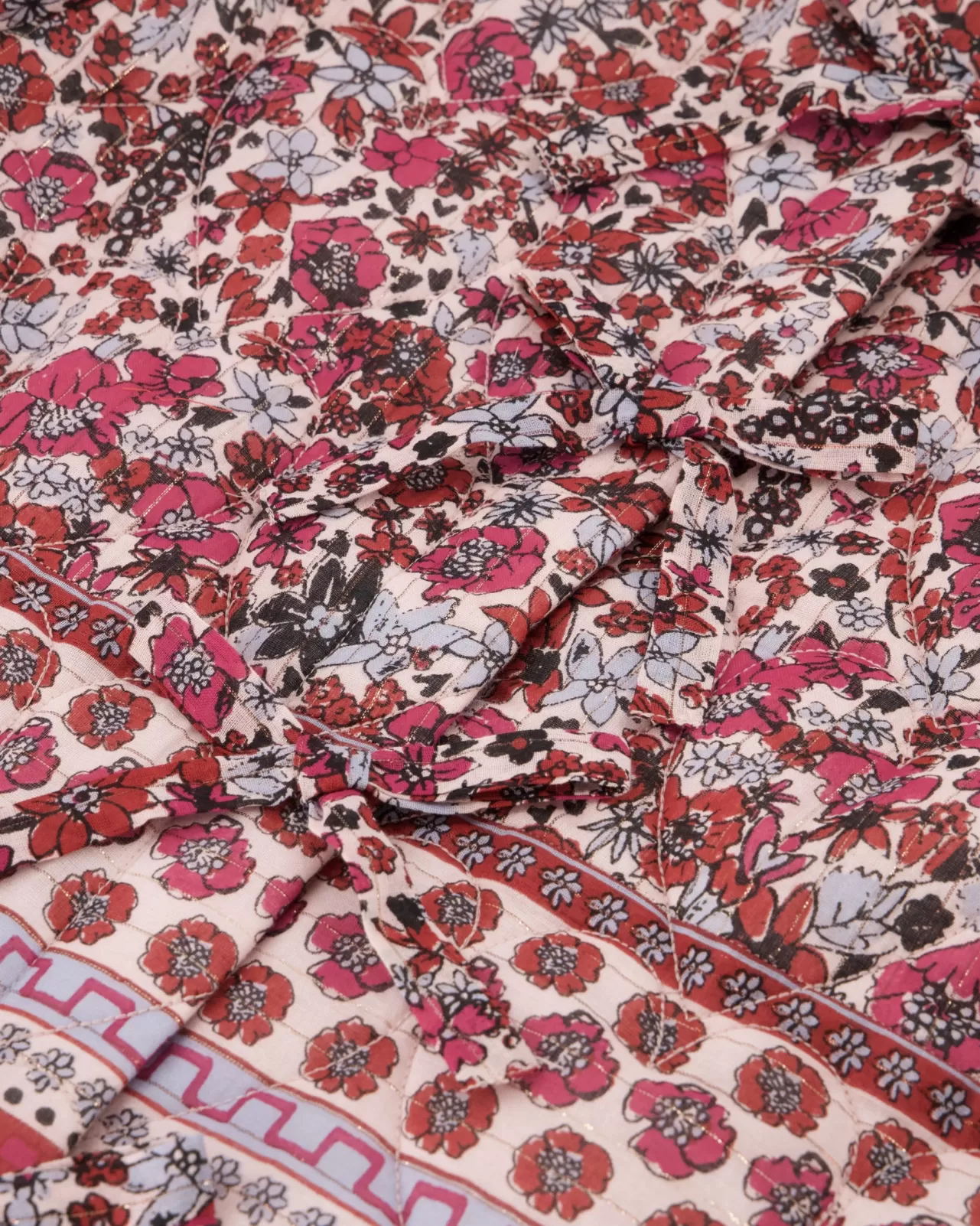 Deze korte getailleerde dames jas heeft een allover bloemenprint met strikken aan de voorkant. Dit stijlvolle stuk is gevoerd en heeft lange mouwen. Gemaakt van 98% katoen en 2% gemetalliseerde vezels, waardoor het een van onze meer verantwoorde stijlen is. Perfect om over je favoriete top te dragen, deze jas vult elke outfit aan met zijn veelzijdige en chique ontwerp.