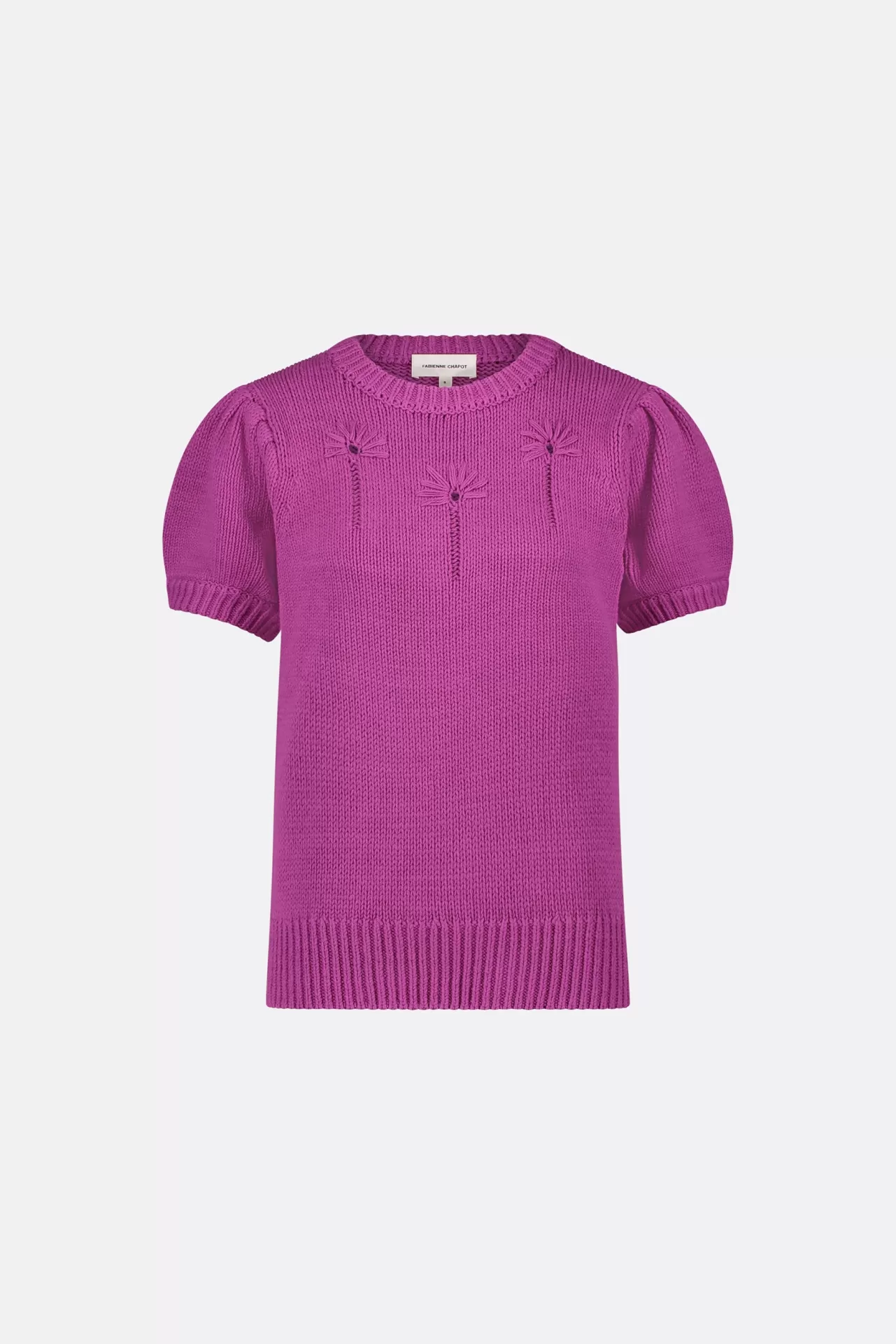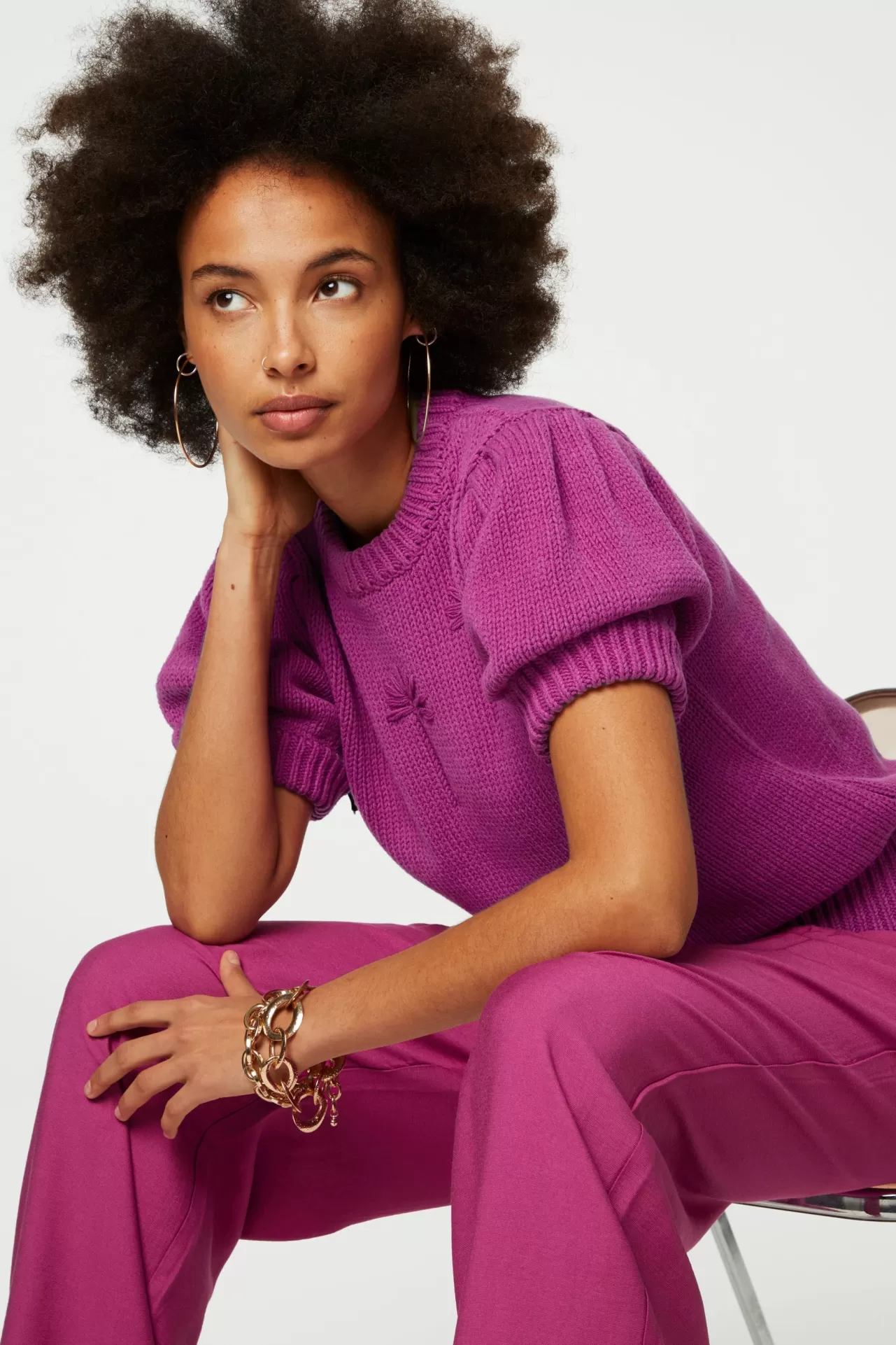 Deze dames trui met korte mouwen in het paars is een veelzijdig kledingstuk voor elke gelegenheid. Deze trui is gemaakt van 60% katoen en heeft een ronde hals, korte pofmouwen en geborduurde bloemen op de borst, voor een comfortabele en stijlvolle pasvorm. Combineer de Raf Pullover met onze Mitzi Rok voor een comfortabele en casual look
