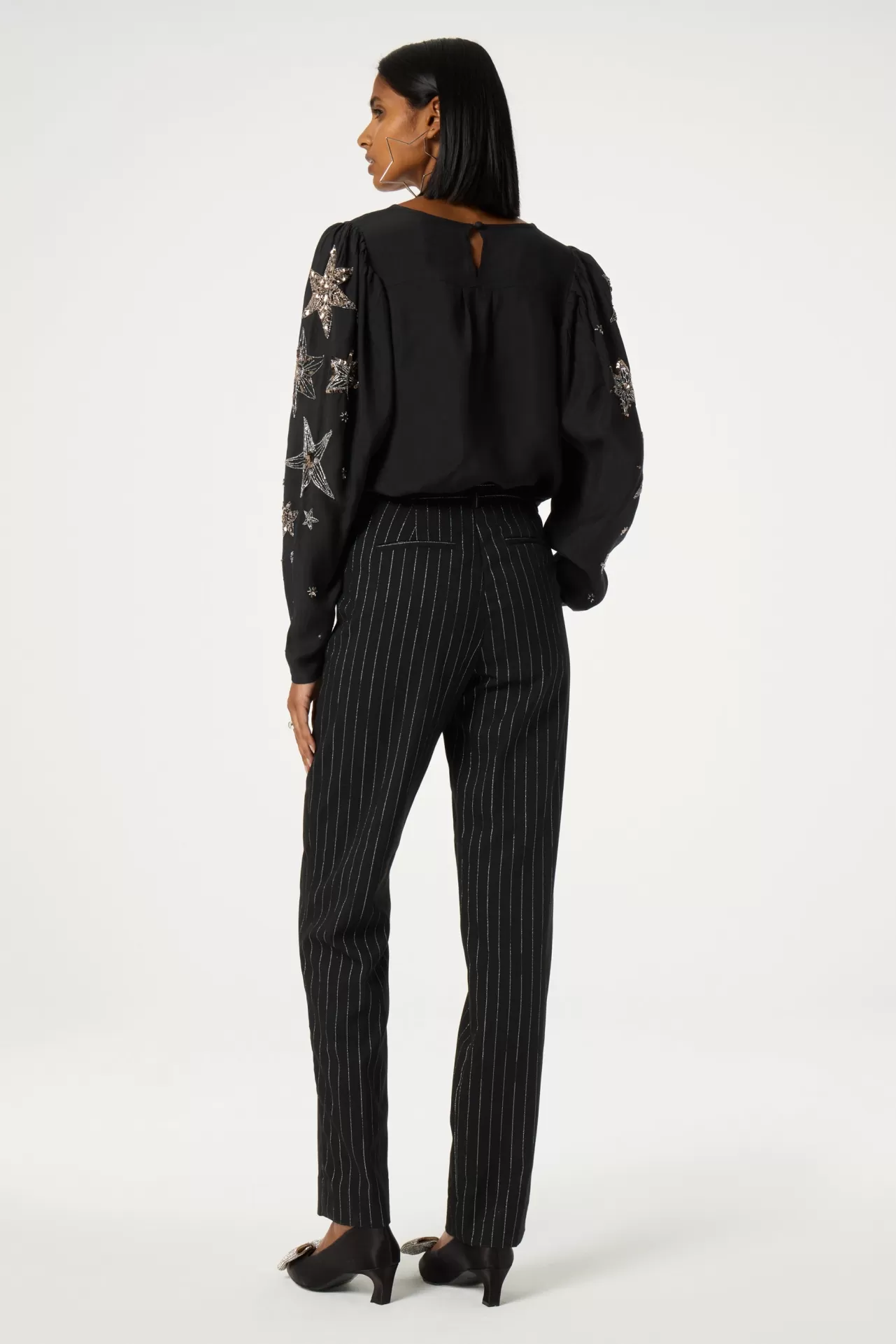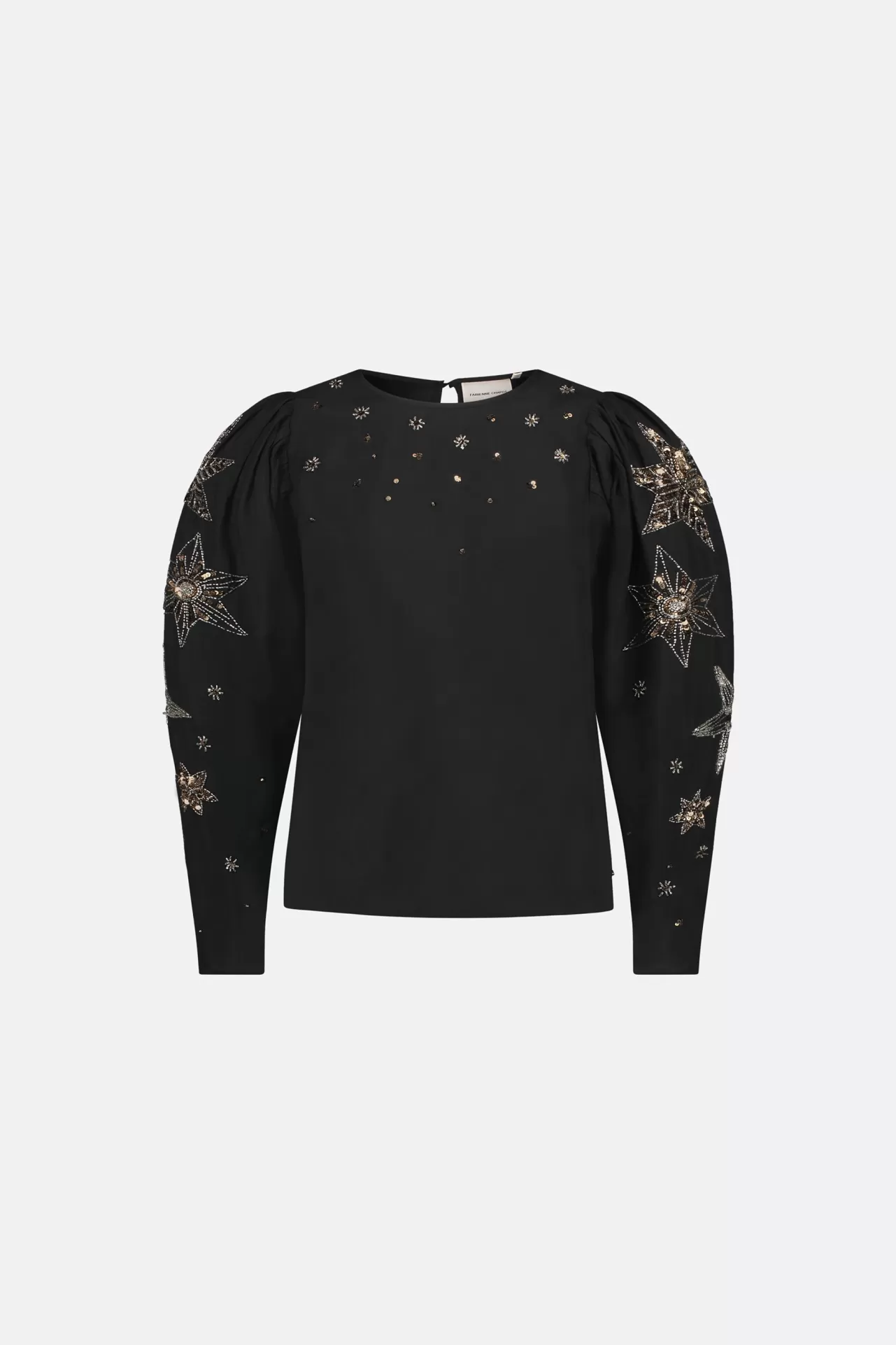Dit zwarte dames topje heeft een ronde hals, lange pofmouwen en sterborduurwerk. Gemaakt van 100% viscose. Combineer het met onze Elliot broek om de look af te maken.