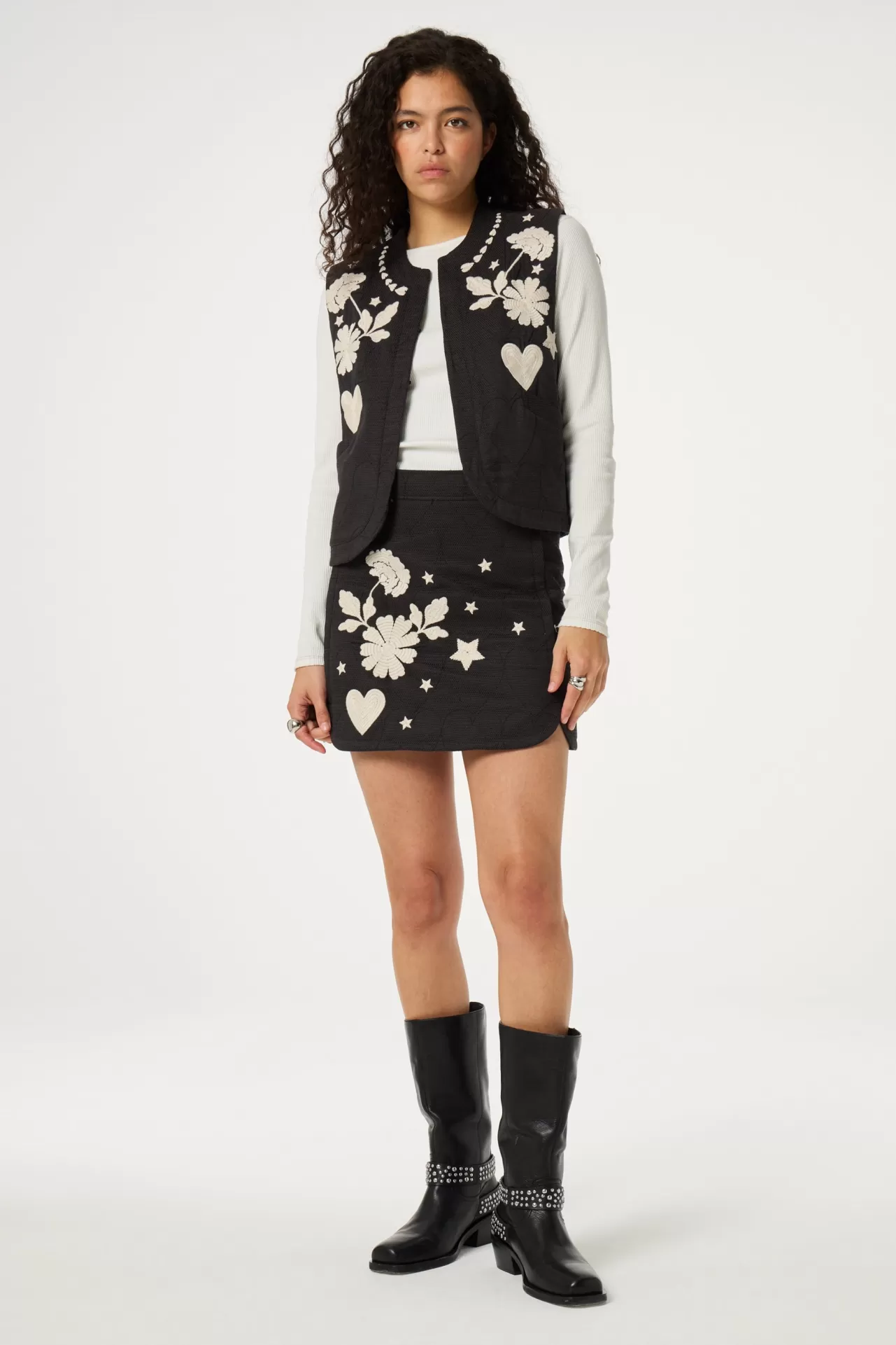 Deze zwarte dames minirok met bloemen-, hart- en sterrendetails is perfect voor zowel casual als feestelijke gelegenheden. Gemaakt van 61% katoen en 39% polyester, biedt de rok een flatterende pasvorm met zijn A-lijn silhouet. Combineer hem met onze bijpassende Berry gilet voor een matching look.