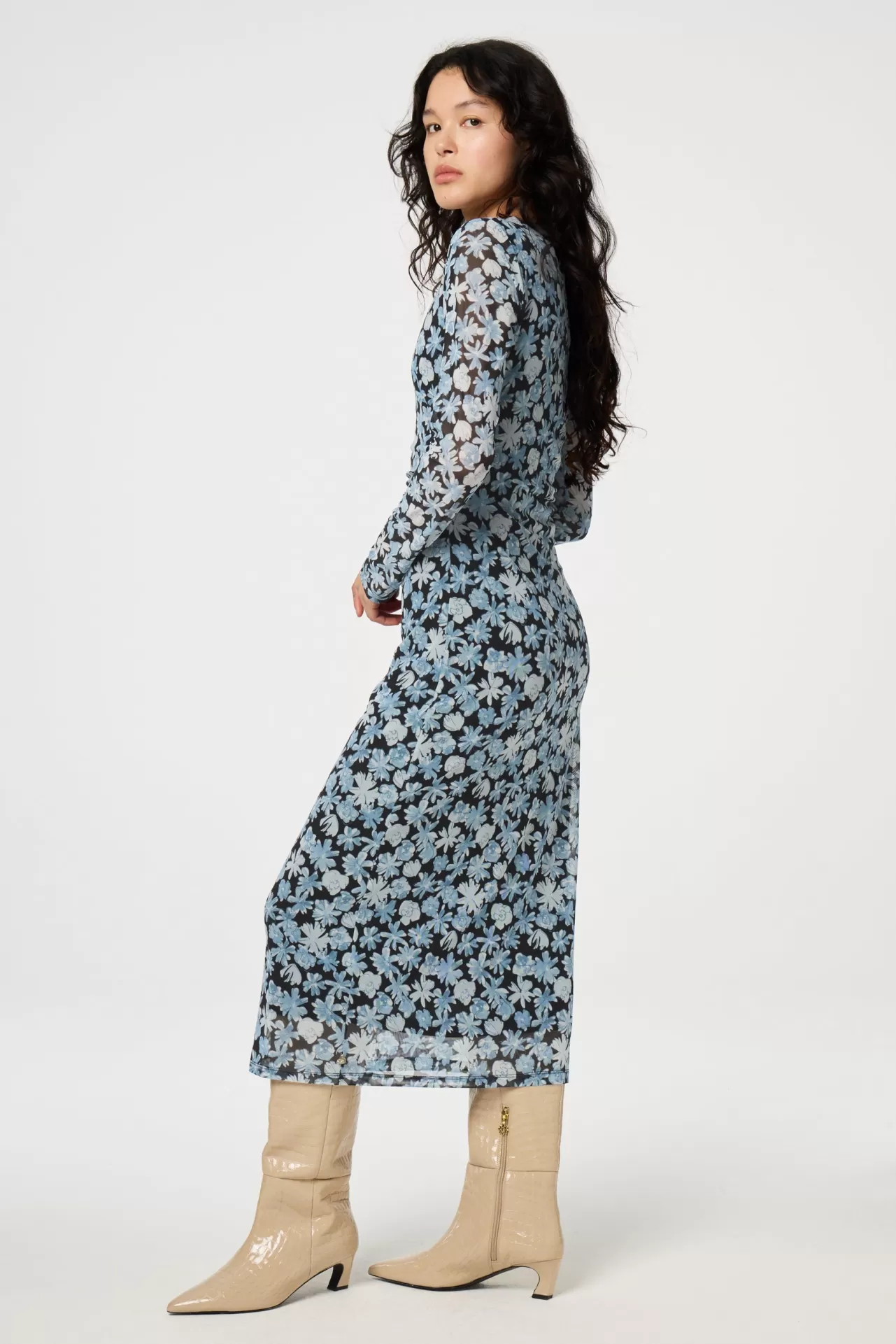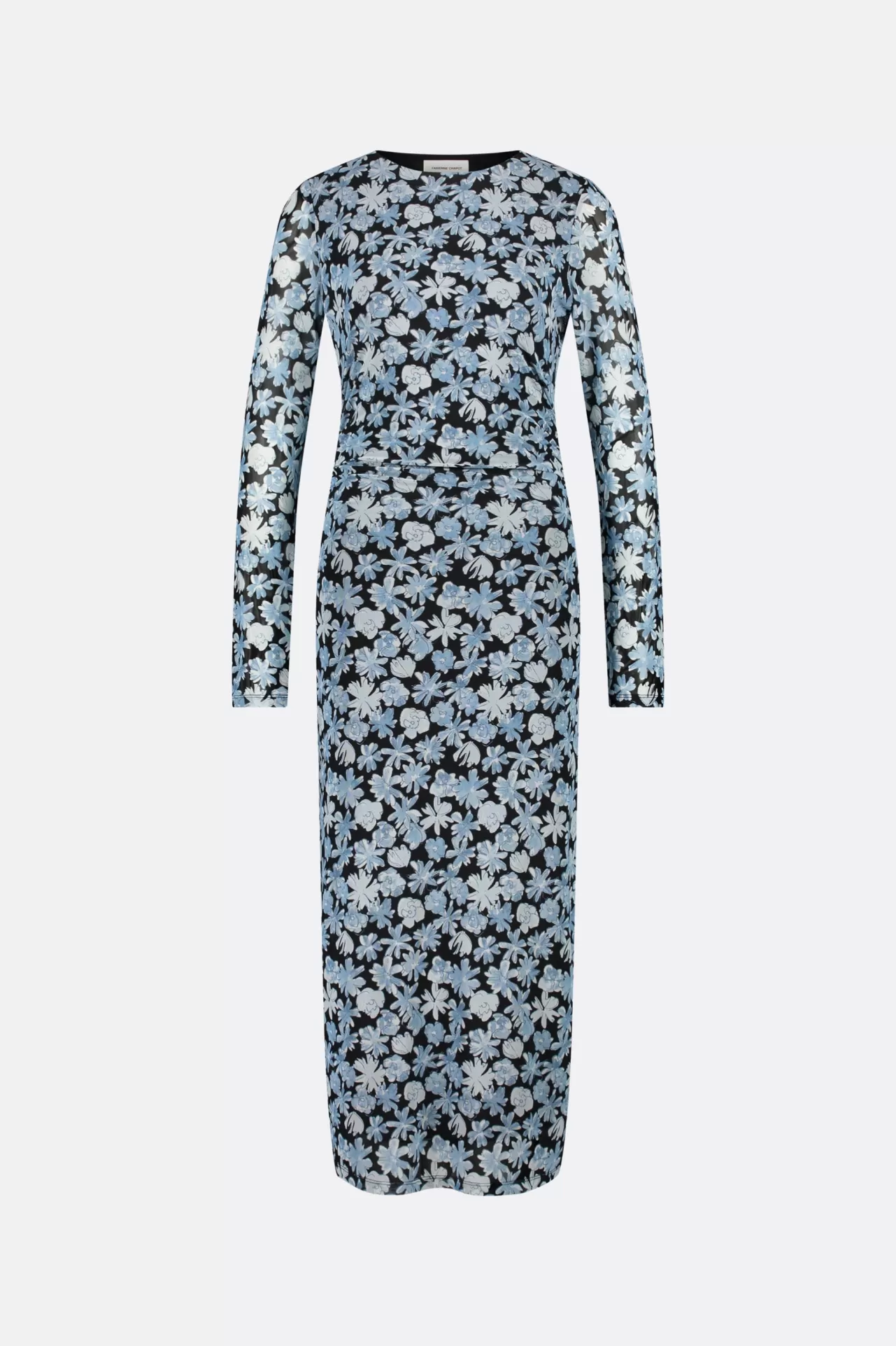 Deze mesh jurk heeft een slim fit, lange mouwen en een ronde halslijn, met een zwart-blauwe bloemenprint. Gemaakt van 94% gerecycled polyester en 6% elastaan, is het een van onze meer verantwoorde stijlen. Een dagelijkse jurk die zowel chique als casual gestyled kan worden.